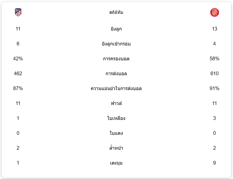 แม้ว่าแอตเลติโก้ มาดริด จะมีการครองบอลเพียง 42% เมื่อเทียบกับคิโรน่าที่ครองบอลได้ถึง 58% แต่ทีมเจ้าบ้านกลับมีโอกาสยิงประตูมากถึง 11 ครั้ง โดยเข้ากรอบ 6 ครั้ง ส่วนคิโรน่ามีโอกาสยิง 13 ครั้ง แต่เข้ากรอบเพียง 4 ครั้ง แสดงให้เห็นถึงประสิทธิภาพในการยิงของแอตเลติโก้ มาดริด ความแม่นยำในการส่งบอลของคิโรน่าอยู่ที่ 91% จากการส่งบอลทั้งหมด 610 ครั้ง ขณะที่แอตเลติโก้ มาดริด มีความแม่นยำ 87% จากการส่งบอล 462 ครั้ง นอกจากนี้ยังมีการทำฟาวล์เกิดขึ้นมากมาย โดยทั้งสองทีมทำฟาวล์เท่ากันที่ 11 ครั้ง คิโรน่าได้รับใบเหลือง 3 ใบ ส่วนแอตเลติโก้ มาดริด ได้รับ 1 ใบ
