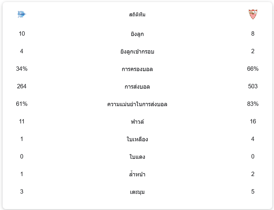 แม้ว่าเซบีย่าจะครองบอลได้ถึง 66% เทียบกับอลาเบสที่ครองบอลเพียง 34% แต่อลาเบสใช้โอกาสได้ดีกว่าด้วยการยิง 10 ครั้ง เข้ากรอบ 4 ครั้ง ขณะที่เซบีย่ายิงเพียง 8 ครั้ง เข้ากรอบ 2 ครั้ง นอกจากนี้ เซบีย่ายังส่งบอลได้มากถึง 503 ครั้ง โดยมีความแม่นยำ 83% ในขณะที่อลาเบสส่งบอล 264 ครั้ง และมีความแม่นยำในการส่งเพียง 61% แต่จบสกอร์ได้ดีกว่า