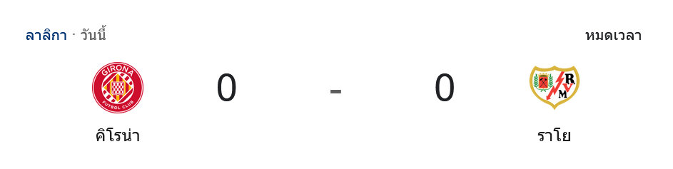 การแข่งขัน ลาลิกา 2024 นัดนี้ระหว่าง คิโรน่า กับ ราโย่ บาเยกาโน่ จบลงด้วยผลเสมอ 0-0 ที่สนามของคิโรน่า ทั้งสองทีมไม่สามารถยิงประตูใส่กันได้ แม้เจ้าบ้านคิโรน่าจะครองเกมและสร้างโอกาสได้มากกว่า แต่ราโย่ บาเยกาโน่ก็ยังสามารถตั้งรับได้อย่างแข็งแกร่ง ส่งผลให้เกมจบลงด้วยการแบ่งแต้มกันไป