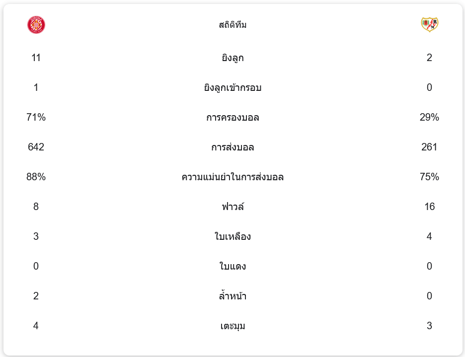 จากสถิติการแข่งขัน คิโรน่า ครองบอลได้มากถึง 71% และมีการส่งบอลสำเร็จถึง 642 ครั้ง ขณะที่ ราโย่ บาเยกาโน่ ครองบอลเพียง 29% และส่งบอลเพียง 261 ครั้ง แต่การทำฟาวล์ของราโย่ บาเยกาโน่กลับสูงถึง 16 ครั้ง และรับไป 4 ใบเหลือง แสดงให้เห็นถึงการเล่นเกมรับที่เข้มข้นเพื่อป้องกันประตู