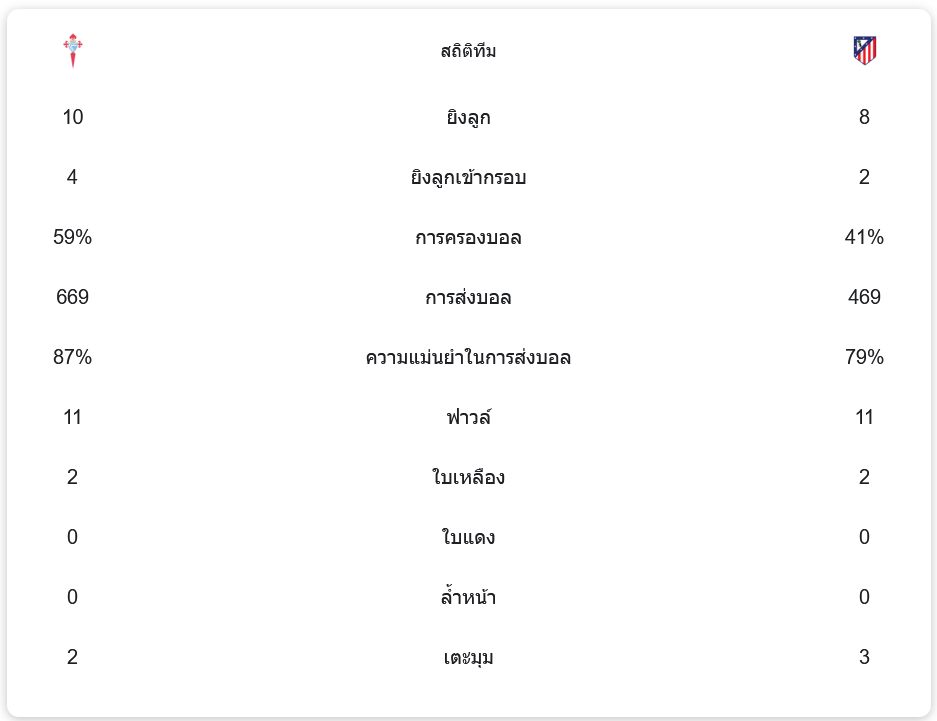 สถิติการแข่งขัน: แม้ว่า เซลต้า บีโก้ จะครองบอลได้มากถึง 59% และส่งบอลได้ถึง 669 ครั้ง แต่ไม่สามารถทำประตูได้เลย ขณะที่ แอตเลติโก มาดริด ส่งบอลได้น้อยกว่าเพียง 469 ครั้งและยิงเข้ากรอบได้ 2 ครั้งเท่านั้น ซึ่งถือเป็นการใช้โอกาสได้อย่างคุ้มค่า เกมนี้ทั้งสองทีมฟาวล์รวมกันถึง 22 ครั้ง โดยมีใบเหลืองฝั่งละ 2 ใบ