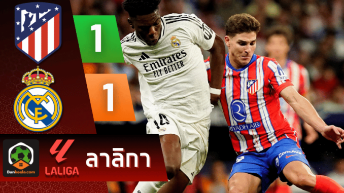 การแข่งขันฟุตบอล ลาลิกา 2024 ในดาร์บี้แมตช์ระหว่าง แอตเลติโก้ มาดริด และ เรอัล มาดริด ที่สนามว่านต๋า เมโทรโปลิตาโน่ จบลงด้วยการเสมอกัน 1-1 โดยทั้งสองทีมแสดงให้เห็นถึงความสามารถในเกมรุกและการป้องกันที่เหนียวแน่น แม้ว่าจะมีการได้ประตูและเหตุการณ์สำคัญเกิดขึ้นในช่วงทดเวลาบาดเจ็บ