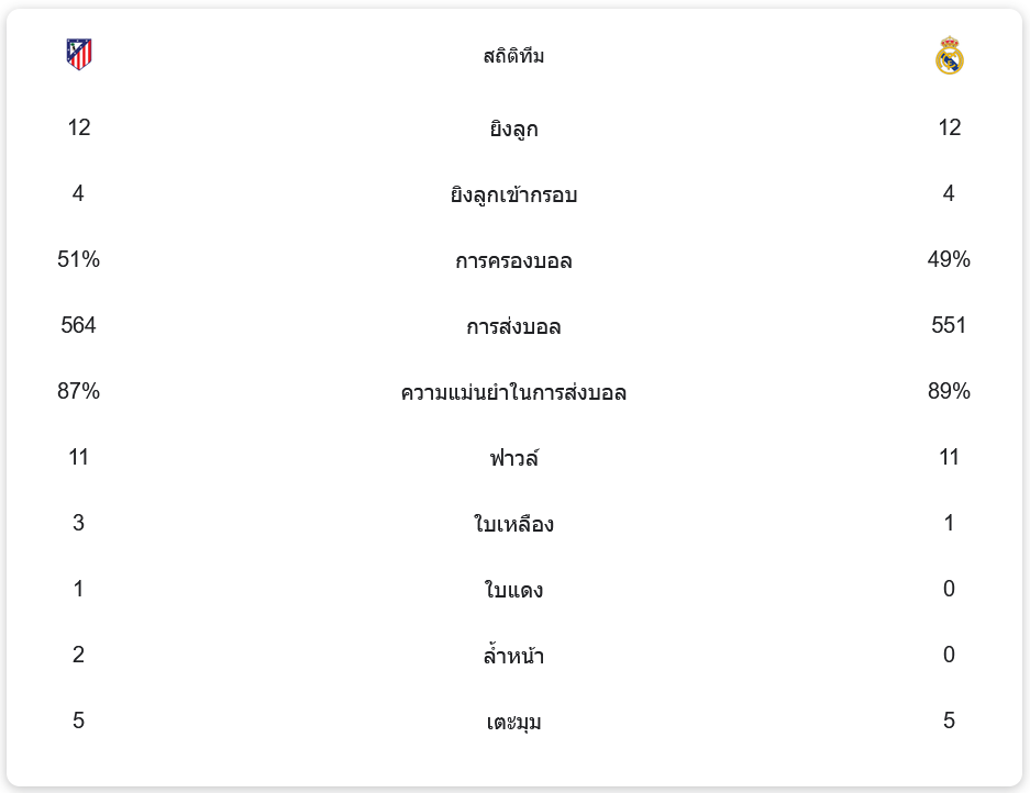 ทั้งสองทีมมีสถิติที่สูสีกันอย่างมาก โดยทั้งแอตเลติโก้ มาดริดและเรอัล มาดริดต่างมีโอกาสยิงทั้งหมด 12 ครั้ง และยิงเข้ากรอบ 4 ครั้งเท่ากัน การครองบอลเป็นแอตเลติโก้ที่ทำได้ดีกว่าเล็กน้อยที่ 51% เทียบกับเรอัล มาดริดที่ 49% การส่งบอลรวมทั้งหมดใกล้เคียงกันมาก โดยแอตเลติโก้มีการส่งบอล 564 ครั้ง และเรอัล มาดริด 551 ครั้ง ทั้งสองทีมมีความแม่นยำในการจ่ายบอลที่สูงเช่นกัน โดยแอตเลติโก้อยู่ที่ 87% และเรอัล มาดริด 89%