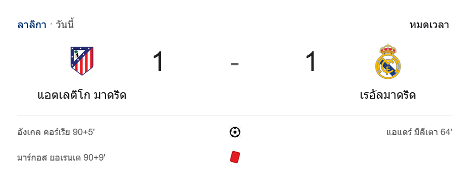 - 90+5′: อังเคล คอร์เรอา ยิงตีเสมอให้แอตเลติโก้ มาดริด 1-1