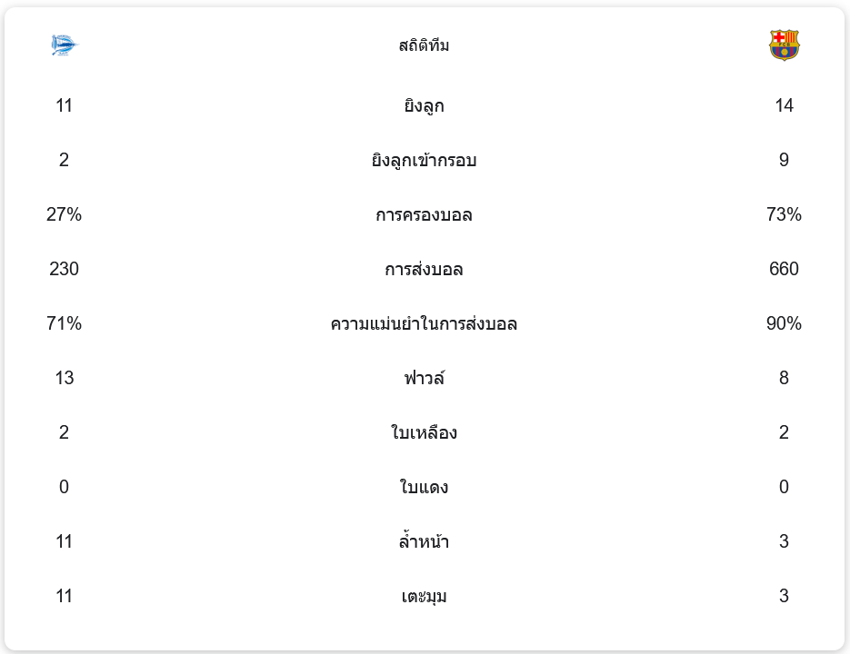 บาร์เซโลน่า ครองบอลได้มากถึง 73% ของเกม มีการส่งบอลทั้งหมด 660 ครั้งและมีความแม่นยำในการส่งบอลสูงถึง 90% ส่วน อลาเบส ครองบอลเพียง 27% ส่งบอล 230 ครั้ง และมีความแม่นยำในการส่งบอล 71% ในด้านการยิงประตู บาร์เซโลน่ามีโอกาสยิงทั้งหมด 14 ครั้ง โดยเข้ากรอบ 9 ครั้ง ส่วนอลาเบสยิงทั้งหมด 11 ครั้ง และเข้ากรอบเพียง 2 ครั้ง