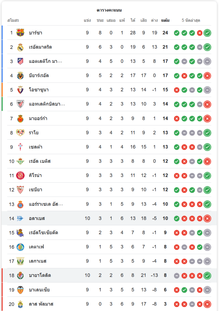 ชัยชนะครั้งนี้ทำให้ เรอัล บายาโดลิด ขยับขึ้นอันดับที่ 18 ของตารางคะแนนลาลิกา มี 8 คะแนนจาก 10 นัด ขณะที่ อลาเบส ยังคงอยู่อันดับ 14 มี 10 คะแนนจาก 10 นัด ต้องเร่งแก้ปัญหาการเล่นในนัดถัดไปหากต้องการขยับอันดับขึ้น