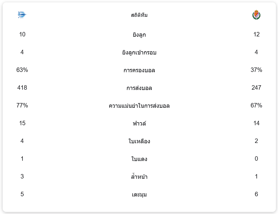 เกมนี้ทั้งสองทีมเล่นกันอย่างดุเดือด อลาเบส ครองบอลได้มากถึง 63% พร้อมส่งบอลถึง 418 ครั้ง และความแม่นยำในการส่งบอลอยู่ที่ 77% ขณะที่ บายาโดลิด ครองบอลได้เพียง 37% แต่เน้นเกมสวนกลับและใช้โอกาสที่มีอย่างคุ้มค่า แม้จะมีการส่งบอลเพียง 247 ครั้ง แต่ก็สามารถยิงเข้ากรอบได้ถึง 4 ครั้งจากการยิงทั้งหมด 12 ครั้ง ทั้งสองทีมยังมีการฟาวล์รวมกันถึง 29 ครั้ง โดยอลาเบสรับใบเหลือง 4 ใบและใบแดง 1 ใบ ส่วนบายาโดลิดรับไป 2 ใบเหลือง