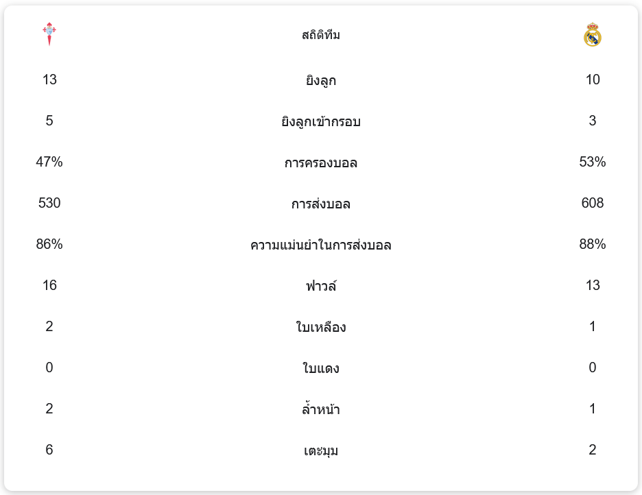 ในเกมนี้ เรอัล มาดริด ครองบอลได้เหนือกว่าเล็กน้อยที่ 53% ขณะที่ เซลต้า บีโก้ ครองบอล 47% เซลต้ามีโอกาสยิงทั้งหมด 13 ครั้ง เข้ากรอบ 5 ครั้ง ส่วนเรอัล มาดริดยิงทั้งหมด 10 ครั้ง เข้ากรอบ 3 ครั้ง การส่งบอลของราชันขาวมีความแม่นยำสูงถึง 88% จากการส่งบอล 608 ครั้ง ขณะที่เซลต้าส่งบอล 530 ครั้ง มีความแม่นยำ 86% เซลต้าทำฟาวล์ 16 ครั้ง รับใบเหลือง 2 ใบ ขณะที่เรอัล มาดริดทำฟาวล์ 13 ครั้ง และรับใบเหลือง 1 ใบ