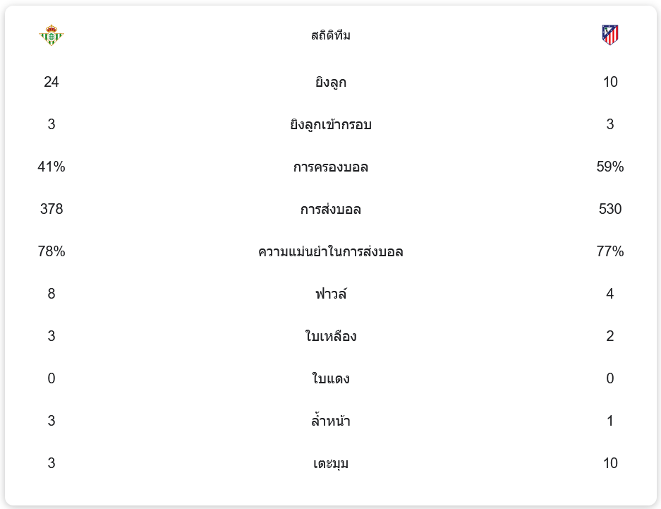 สถิติลาลิกา 2024 ระหว่าง เรอัล เบติส 1-0 แอตเลติโก้ มาดริด