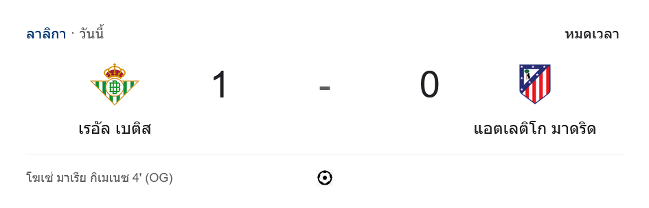 ผลบอลลาลิกา 2024 ระหว่าง เรอัล เบติส 1-0 แอตเลติโก้ มาดริด วันนี้ 28/10/67