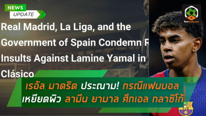 เรอัล มาดริด สโมสรยักษ์ใหญ่แห่งลาลีกาสเปน ออกแถลงการณ์แสดงจุดยืนอย่างหนักแน่นประณามพฤติกรรมการเหยียดผิวของแฟนบอลกลุ่มหนึ่งที่กระทำการในสนาม ซานติอาโก้ เบร์นาเบว เหยียดผิว ลามีน ยามาล ปีกดาวรุ่งของ บาร์เซโลน่า ในศึก เอล กลาซิโก้ ที่จบลงด้วยการพ่ายแพ้ของราชันชุดขาวอย่างยับเยิน 0-4 เมื่อคืนวันเสาร์ที่ผ่านมา โดยทางสโมสรยืนยันว่าได้เริ่มกระบวนการสอบสวนอย่างเข้มงวดแล้ว เพื่อหาตัวผู้กระทำผิดมารับผิดชอบต่อเหตุการณ์อันน่าอัปยศนี้