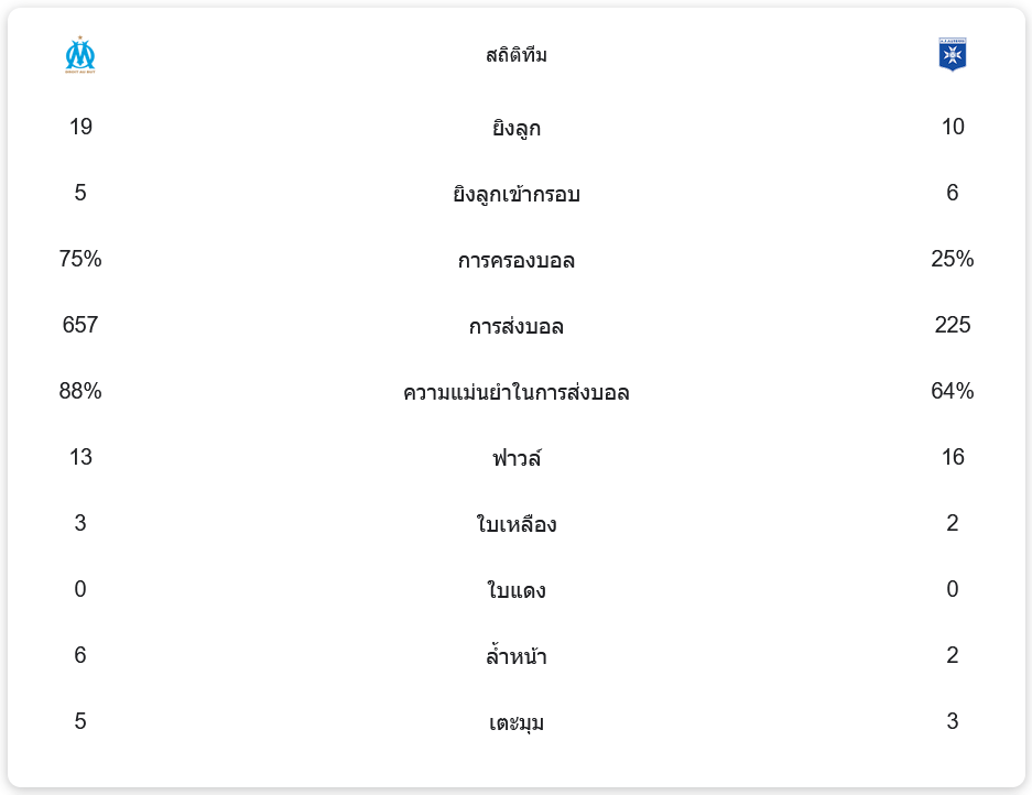 ในเกมนี้ โอลิมปิก มาร์กเซย ครองบอลได้ถึง 75% และมีโอกาสยิงประตู 19 ครั้ง แต่กลับยิงเข้ากรอบเพียง 5 ครั้ง ขณะที่ เอเจ โอแซร์ ครองบอลได้เพียง 25% แต่มีโอกาสยิงเข้ากรอบถึง 6 ครั้งจากทั้งหมด 10 ครั้ง ความแม่นยำในการส่งบอลของมาร์กเซยอยู่ที่ 88% เทียบกับโอแซร์ที่ทำได้ 64% แสดงให้เห็นถึงการใช้โอกาสที่มีประสิทธิภาพของทีมเยือน