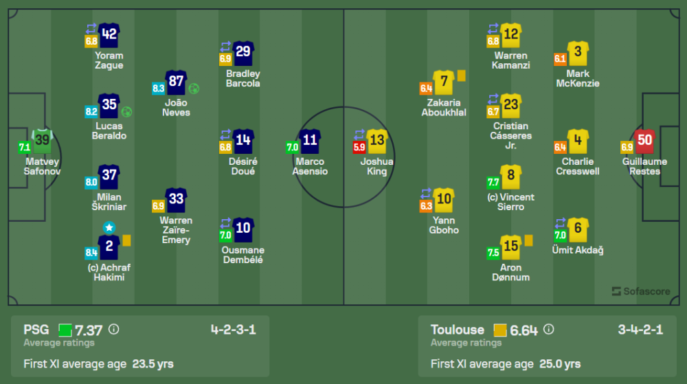 เข้าสู่ครึ่งหลัง เปแอสเช ยังคงเดินหน้าบุกอย่างต่อเนื่อง และในนาทีที่ 84 ลูคัส เบรัลโด้ โขกประตูที่สองให้ทีมจากลูกเตะมุม ก่อนที่ วิตินญ่า จะปิดกล่องด้วยประตูในช่วงทดเวลาบาดเจ็บนาทีที่ 90+1 ส่งผลให้เปแอสเชเอาชนะไปอย่างขาดลอย 3-0 แม้ตูลูสจะพยายามตั้งรับแน่นและสวนกลับ แต่ไม่สามารถเจาะแนวรับของเจ้าบ้านได้เลย