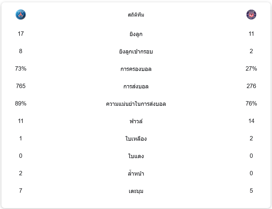 ปารีส แซงต์ แชร์กแมง ครองบอลถึง 73% เทียบกับ ตูลูส ที่ทำได้เพียง 27% เจ้าบ้านมีโอกาสยิงถึง 17 ครั้ง เข้ากรอบ 8 ครั้ง ขณะที่ตูลูสมีโอกาสยิงเพียง 11 ครั้ง และเข้ากรอบ 2 ครั้ง เปแอสเชยังผ่านบอลสำเร็จถึง 765 ครั้ง ด้วยความแม่นยำ 89% สูงกว่าตูลูสที่ผ่านบอลสำเร็จเพียง 276 ครั้ง ความเหนือชั้นในทุกด้านของเปแอสเชช่วยให้พวกเขาคว้าชัยในเกมนี้ได้แบบไร้ปัญหา