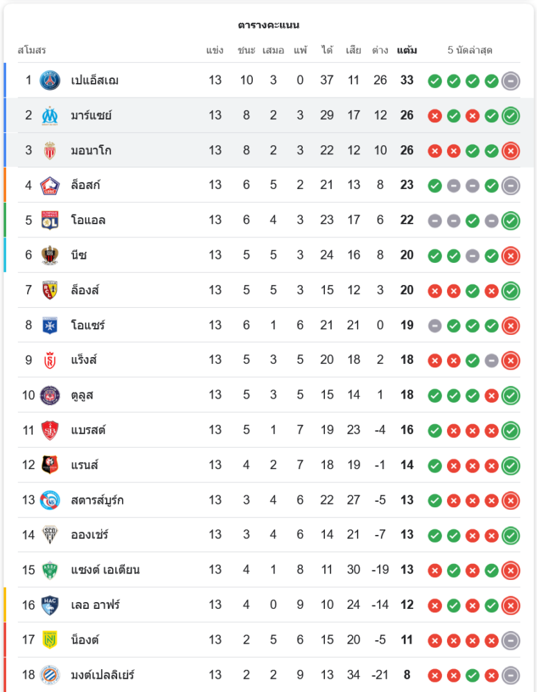 มาร์กเซยยังคงรั้งอันดับสองในตารางคะแนนลีกเอิง ด้วยคะแนน 26 แต้ม จาก 13 นัด ส่วนโมนาโกอยู่อันดับสาม มีคะแนนเท่ากันแต่ผลต่างประตูได้เสียเป็นรอง
