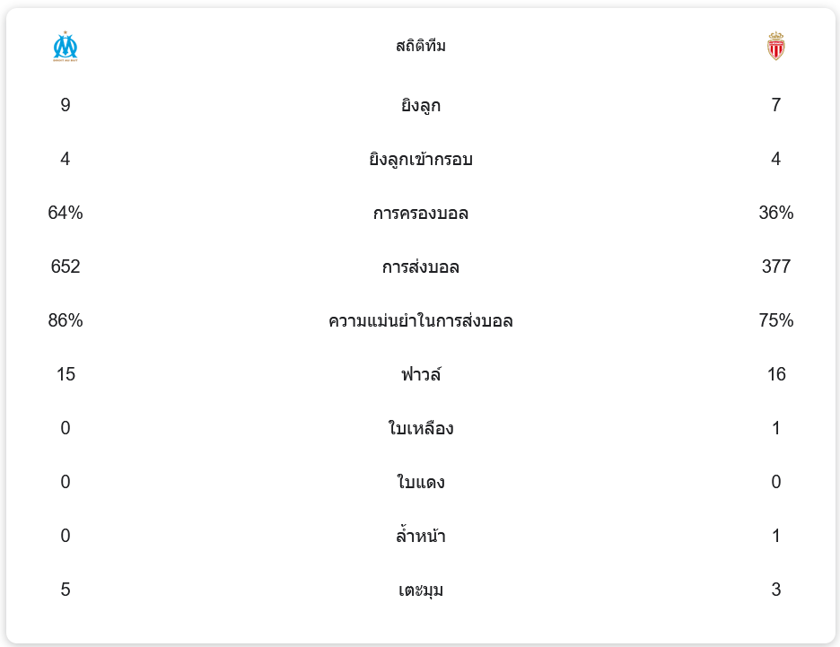 แม้มาร์กเซยจะยิงรวมเพียง 9 ครั้ง แต่สามารถเปลี่ยนเป็นประตูได้ 2 ครั้ง ขณะที่โมนาโกยิง 7 ครั้งและเปลี่ยนเป็นประตูเพียงครั้งเดียว ด้านการครองบอล มาร์กเซยเหนือกว่าที่ 64% เทียบกับ 36% ของโมนาโก