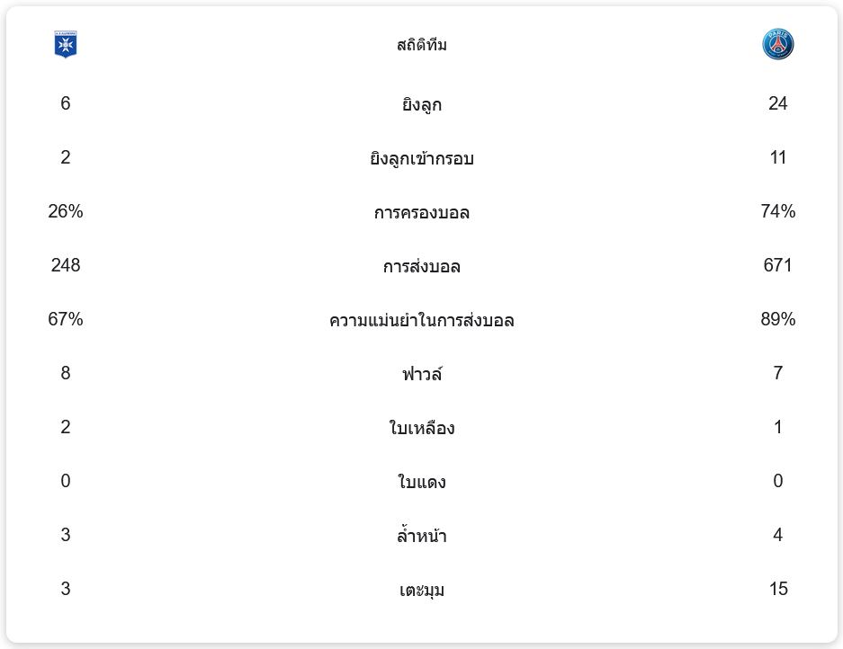 ปารีส แซงต์ แชร์กแมง ครองบอลถึง 74% สร้างโอกาสยิง 24 ครั้ง แต่ความแม่นยำในการยิงยังไม่เพียงพอที่จะผ่านมือผู้รักษาประตูโอแซร์ ด้านเจ้าบ้านมีโอกาสยิงเพียง 6 ครั้ง แต่เกมรับของพวกเขาโดดเด่นมาก โดยเฉพาะ ดอนาวาน เลออน ที่เซฟลูกสำคัญได้หลายครั้ง