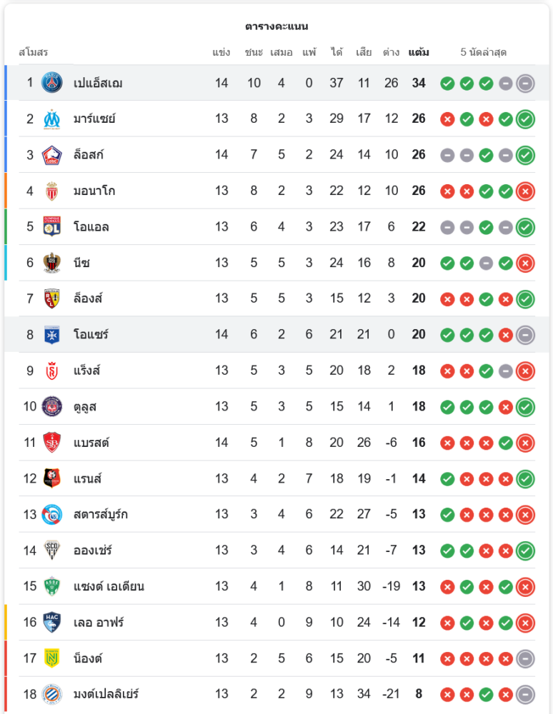 ปารีส แซงต์ แชร์กแมง ยังคงนำเป็นจ่าฝูงด้วย 34 คะแนนจาก 14 นัด ส่วนโอแซร์ อยู่อันดับ 8 มี 20 คะแนน