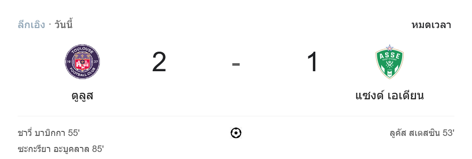 ความมันส์เริ่มต้นที่นาที 53 ลูคัส สเตสซิน ยิงให้แซงต์ เอเตียนขึ้นนำ 1-0 แต่เพียงสองนาทีถัดมา ชาวี วอร์เรน บาบิก้า ยิงตีเสมอให้ตูลูส 1-1 ก่อนที่นาที 85 ซัคคาเรีย อาบูคลาล จะยิงประตูชัยให้เจ้าบ้านจบเกมด้วยสกอร์ 2-1
