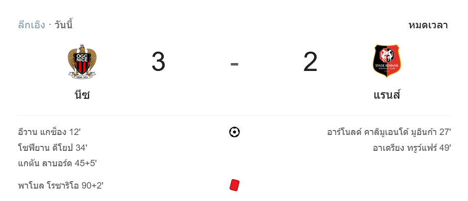 ศึกฟุตบอลลีกเอิง ฝรั่งเศส 2024 นัดระหว่าง นีซ พบ แรนส์ จบลงด้วยผลบอลสดที่สร้างความตื่นเต้นอย่างมาก โดยนีซเป็นฝ่ายคว้าชัยไปได้ 3-2 ในเกมที่เต็มไปด้วยจังหวะดุเดือดและการต่อสู้อย่างหนักหน่วง ทั้งสองทีมต่างงัดฟอร์มการเล่นอย่างสุดความสามารถเพื่อชัยชนะในนัดสำคัญนี้