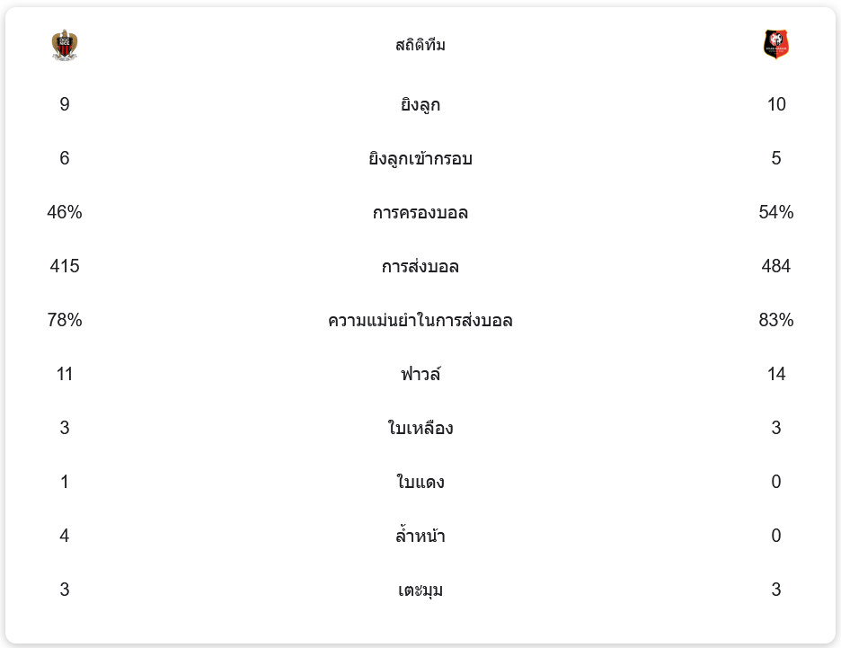 แรนส์ครองบอลมากกว่า 54% เทียบกับ 46% ของนีซ แต่ความแม่นยำในการส่งบอลของนีซอยู่ที่ 78% ขณะที่แรนส์ทำได้ 83% ทั้งสองทีมมีโอกาสยิงใกล้เคียงกัน แต่แรนส์เสียเปรียบในจังหวะสุดท้าย
