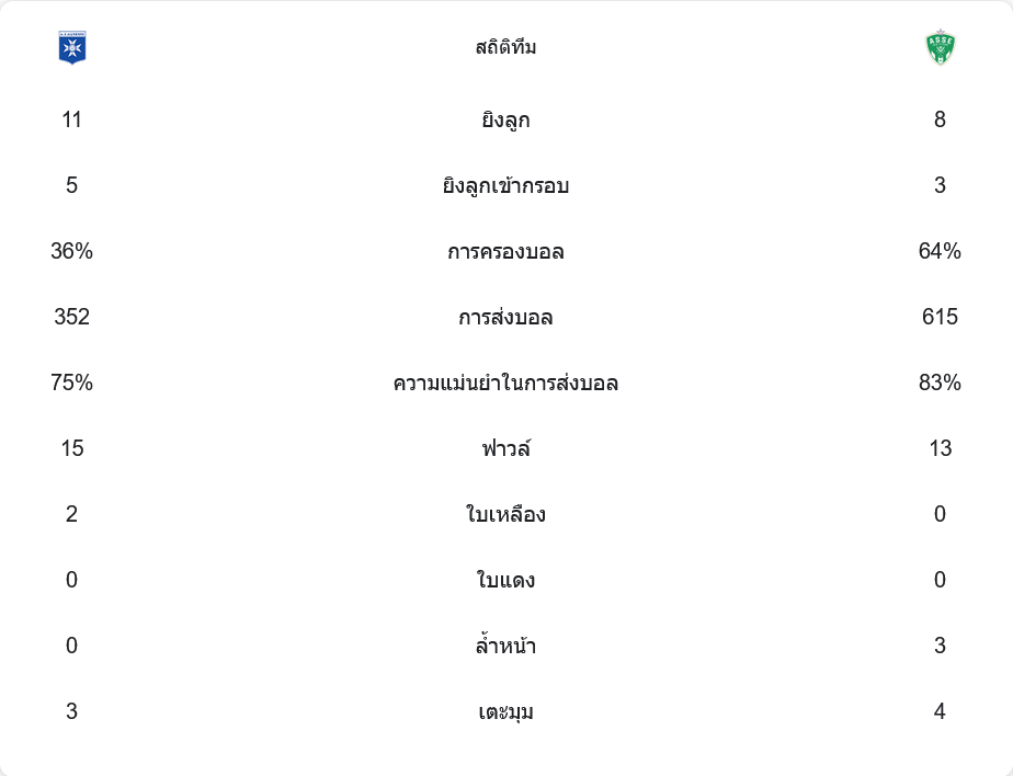 โอแซร์มีโอกาสยิงทั้งหมด 11 ครั้ง เข้ากรอบ 5 ครั้ง ขณะที่แซงต์ เอเตียนมีโอกาส 8 ครั้ง เข้ากรอบ 3 ครั้ง