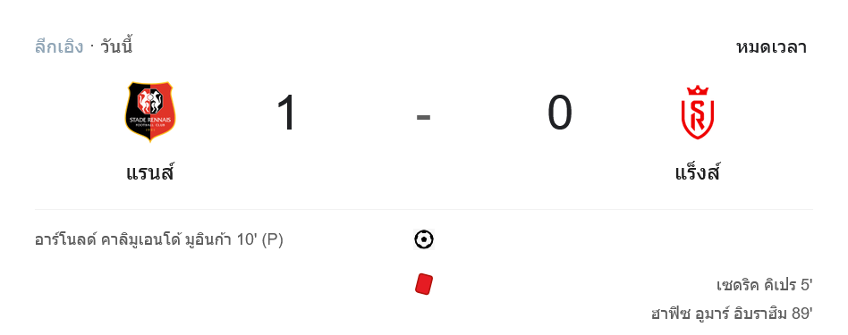 ศึก ลีกเอิง 2024 เกมสุดเดือด แรนส์ เปิดบ้านเฉือนชนะ แร็งส์ 1-0 จากจุดโทษของ อาร์กโนด์ คาลิมูเอนโด้ ตั้งแต่นาทีที่ 10 บ้านผลบอล รายงานสดทุกจังหวะสำคัญ เกมนี้ทีมเยือนต้องเล่นเพียง 10 คนตั้งแต่นาทีที่ 5 หลัง เซดริก คิเปร โดนใบแดง และช่วงท้ายเกม ฮาฟิซ อูมาร์ อิบราฮิม โดนไล่ออกอีกคน