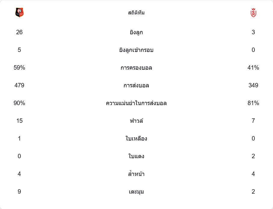 แรนส์ เป็นฝ่ายครองบอลมากกว่า 59% และมีโอกาสยิงถึง 26 ครั้ง ตรงกรอบ 5 ครั้ง ส่วน แร็งส์ ครองบอล 41% ยิงเพียง 3 ครั้ง และไม่สามารถส่งบอลเข้ากรอบได้เลย