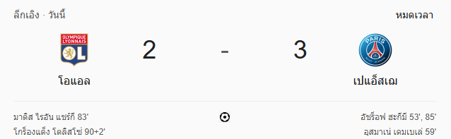 - นาทีที่ 99 กรรมการเป่าหมดเวลา ปารีส แซงต์-แชร์กแมง บุกชนะ โอลิมปิก ลียง 3-2!