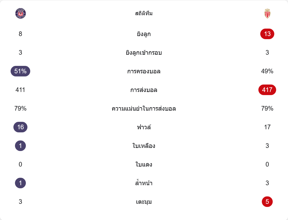 ทั้งสองทีมครองบอลได้ใกล้เคียงกัน โดยตูลูสมีการส่งบอล 411 ครั้ง ด้วยความแม่นยำ 79% ส่วนโมนาโกมีการส่งบอล 417 ครั้ง และความแม่นยำ 79% เช่นกัน ฟาวล์รวมกันทั้งสองทีมสูงถึง 33 ครั้ง แสดงถึงเกมที่ดุดันและเต็มไปด้วยการปะทะ