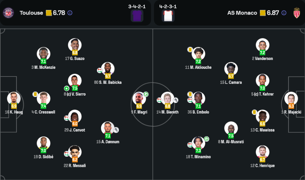 “วิคเตอร์ ซิเอโร” (7.5) กองกลางตัวเก่งของตูลูส ได้รับการยกย่องให้เป็นผู้เล่นยอดเยี่ยมในเกมนี้ ด้วยความสามารถในการครองบอลและการผ่านบอลอย่างแม่นยำ ช่วยให้ตูลูสสามารถตีเสมอในช่วงเวลาสำคัญได้สำเร็จ