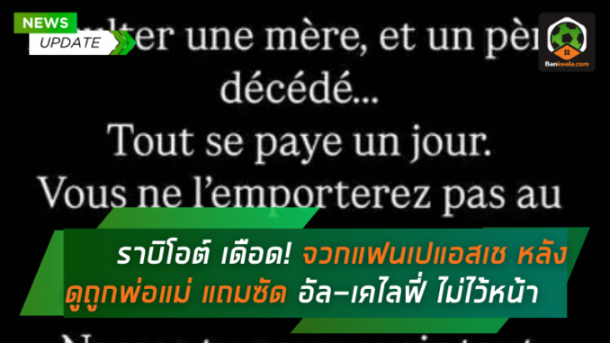 อาเดรียง ราบิโอต์ กองกลางของ โอลิมปิก มาร์กเซย ออกโรงจวกแฟนบอล ปารีส แซงต์-แชร์กแมง อย่างดุเดือด หลังทำป้ายข้อความดูถูกพ่อแม่ของเขาระหว่างศึก เลอ คลาสสิก ที่สนาม ปาร์ก เดส์ แพรงส์ พร้อมทิ้งระเบิดใส่ นาสเซอร์ อัล-เคไลฟี่ บิ๊กบอสของทีมเมืองหลวง ว่าเป็นคนที่แม้จะรวยล้นฟ้าแต่ก็ขาด “ความมีคลาส”