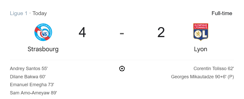 ถึงแม้ว่า ลียง จะมาได้จุดโทษช่วงทดเวลาบาดเจ็บและยิงเข้าโดย จอร์จส์ มิกาอูตัดเซ่ ในนาทีที่ 90+6 แต่ก็ไม่ทันที่จะเปลี่ยนแปลงผลการแข่งขันได้ สุดท้าย สตารส์บูร์ก คว้าชัยไปด้วยสกอร์ 4-2