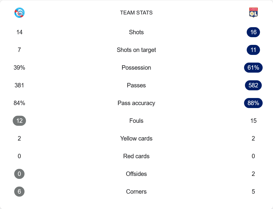 แม้ว่าการครองบอลของ โอลิมปิก ลียง จะมากถึง 61% แต่ สตารส์บูร์ก กลับสามารถเล่นเกมโต้กลับได้อย่างมีประสิทธิภาพ โดยยิงประตูได้ถึง 4 ประตู จากการยิงตรงกรอบ 7 ครั้ง จากทั้งหมด 14 ครั้ง ขณะที่ ลียง ยิงตรงกรอบ 11 ครั้ง จาก 16 ครั้ง แต่สามารถทำได้เพียง 2 ประตู เท่านั้น