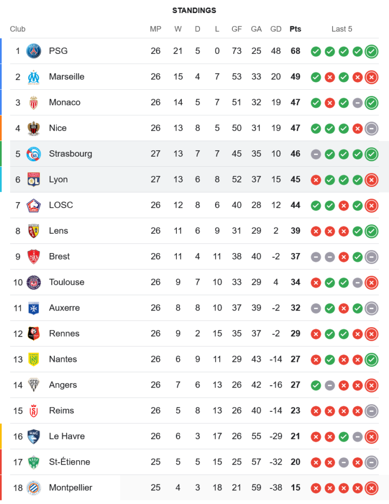 ชัยชนะในเกมนี้ทำให้ สตารส์บูร์ก ขยับขึ้นมาเป็นอันดับที่ 5 ด้วยคะแนน 46 คะแนน จาก 27 นัด ขณะที่ โอลิมปิก ลียง อยู่ในอันดับที่ 6 มี 45 คะแนน จาก 27 นัด