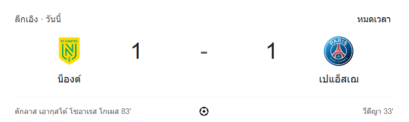 แมตช์นี้ น็องต์ แสดงให้เห็นถึงหัวใจนักสู้แบบเต็มพิกัด แม้โดนนำก่อนแต่ไม่ยอมแพ้ ฮึดไล่ตีเสมอด้วยประตูสุดสวยของดั๊กลาส เอากุสโต้ ขณะที่ ปารีส แซงต์ แชร์กแมง แม้จะครองเกมบุกเกือบตลอดทั้งเกม แต่ก็จบไม่คมพอจนต้องพลาดชัยชนะ ทำให้ ผลบอลสด ปิดลงด้วยการแบ่งแต้มแบบสุดดราม่าในค่ำคืนนี้!