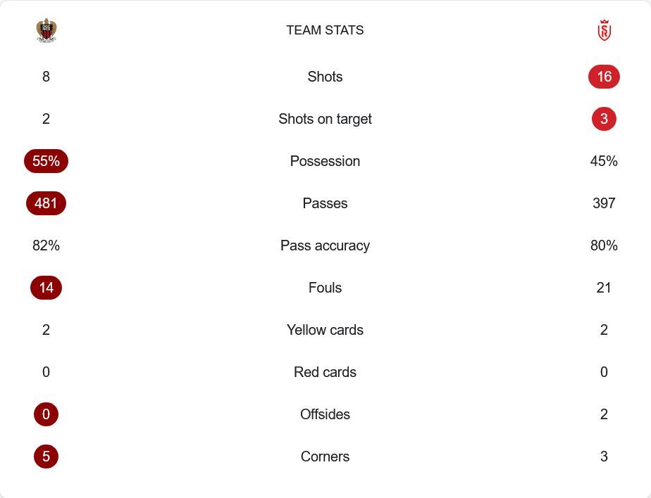 แม้ว่าแร็งส์จะมีโอกาสยิงถึง 16 ครั้ง แต่กลับแม่นเป้าเพียง 3 หน ขณะที่นีซยิง 8 ครั้งเข้าเป้า 2 ครั้ง และได้ประตูขึ้นนำสำคัญ ขณะที่การครองบอลถือว่าสูสีกัน โดยนีซครองบอลได้ 55% ต่อ 45% ของแร็งส์ และการจ่ายบอลก็อยู่ในระดับใกล้เคียงกันคือ 481 ต่อ 397 ครั้ง ตามลำดับ การจ่ายบอลแม่นยำของนีซสูงกว่าที่ 82% ขณะที่แร็งส์อยู่ที่ 80% ด้านเกมรับและแท็คติกแสดงให้เห็นว่านีซแม้ไม่ได้ครองเกมแบบเบ็ดเสร็จ แต่ใช้โอกาสคุ้มค่ากว่า