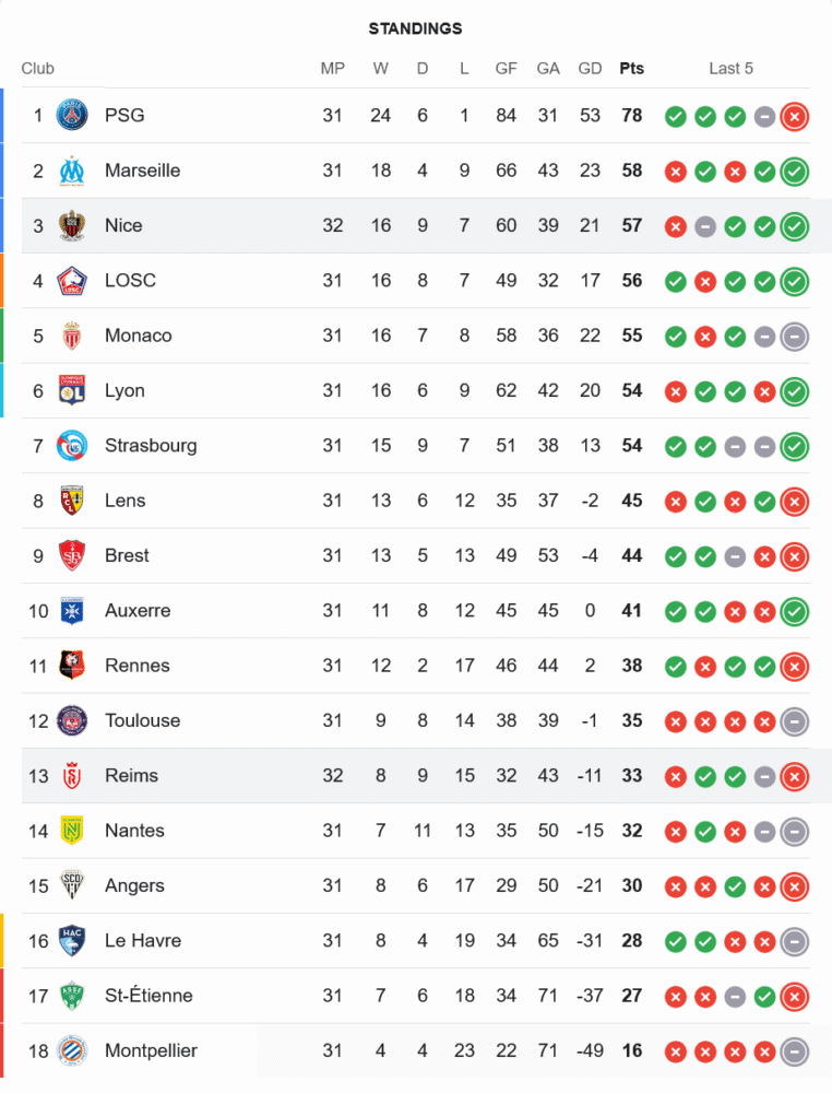 ชัยชนะในเกมนี้ทำให้นีซเก็บเพิ่มเป็น 57 คะแนนจาก 32 นัด ยึดอันดับ 3 อย่างเหนียวแน่น นำหน้าคู่แข่งอย่างลีลล์และโมนาโกที่ตามหลังเพียงแต้มเดียว สถานการณ์ลุ้นตั๋วยุโรปยังดุเดือด ส่วนแร็งส์ที่แพ้ในเกมนี้หยุดอยู่ที่ 33 คะแนนจาก 32 นัด รั้งอันดับ 13 ยังต้องเร่งฟอร์มเพื่อหลุดพ้นโซนล่างของตารางให้ได้ในโปรแกรมโค้งสุดท้าย