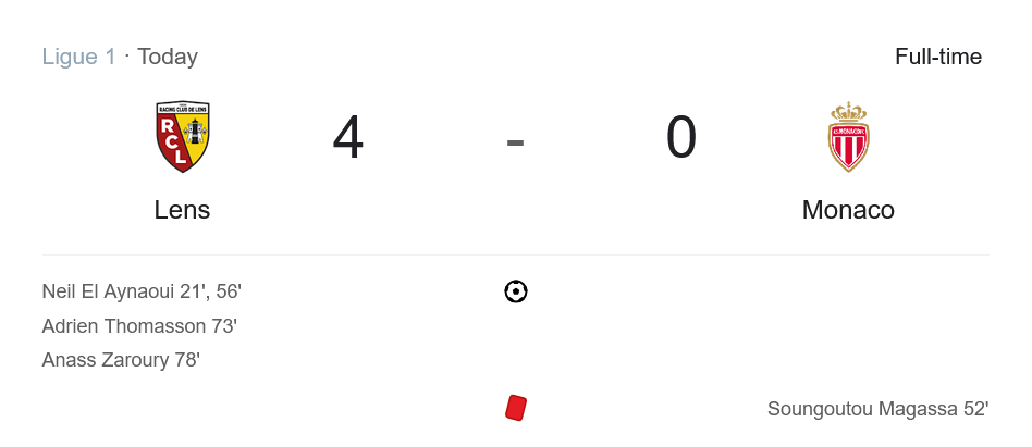 เข้าสู่ครึ่งหลัง นาที 52 โมนาโกต้องมาเหลือผู้เล่นเพียง 10 คนเมื่อ ซูงูตู มากัสซ่า โดนใบแดงโดยตรงจากการตัดฟาวล์ เอล อัยนาอุย ในจังหวะหลุดเดี่ยว ส่งผลให้รูปเกมเปลี่ยนทันที และในนาทีที่ 56 เอล อัยนาอุยก็ไม่ปล่อยโอกาสทองหลุดลอย ซัดลูกที่สองของตัวเองช่วยให้ล็องส์หนีห่าง 2-0 จากนั้น นาที 73 อาเดรียน โตมาสซง เติมขึ้นมายิงสุดคมในเขตโทษเป็น 3-0 ก่อนที่ อนาส ซารูรี่ จะปิดท้ายในนาที 78 ชนิดที่แนวรับโมนาโกไม่มีใครตามทัน ทำให้จบเกม บ้านผลบอล รายงานชัยชนะถล่มทลายของล็องส์ 4-0