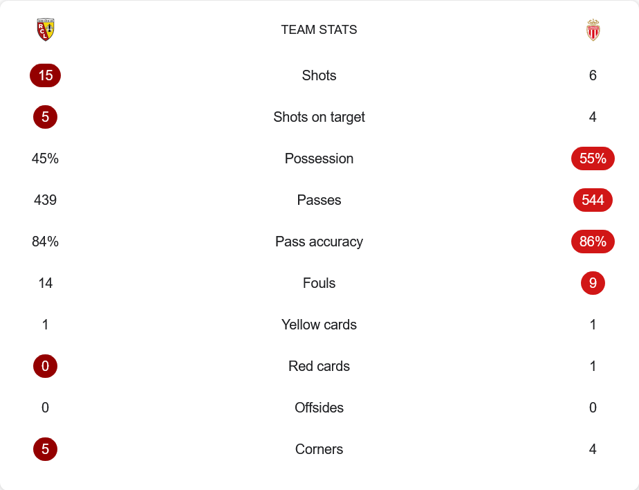 โมนาโกครองบอลได้มากกว่าที่ 55% และผ่านบอลมากถึง 544 ครั้ง ด้วยความแม่นยำ 86% ในขณะที่ล็องส์มีเปอร์เซ็นต์ครองบอลอยู่ที่ 45% และผ่านบอล 439 ครั้ง ด้วยความแม่นยำ 84% แม้จะครองบอลน้อยกว่า แต่ล็องส์กลับมีโอกาสยิงมากถึง 15 ครั้ง เข้ากรอบ 5 ครั้ง และแปรเปลี่ยนเป็น 4 ประตู ขณะที่โมนาโกยิง 6 ครั้ง เข้ากรอบ 4 ครั้ง แต่เจาะไม่เข้า