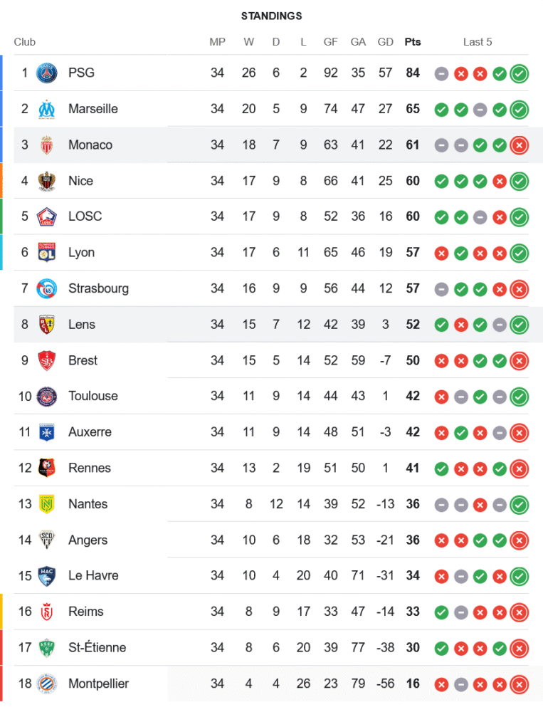 โมนาโกยังคงอยู่อันดับ 3 มี 61 คะแนน จาก 34 นัด แต่ถูกไล่จี้อย่างใกล้ชิดจากนีซ และลียง ส่วนล็องส์ขยับขึ้นมาอยู่อันดับ 8 มี 52 คะแนน พร้อมลุ้นพื้นที่ยุโรปในช่วงโค้งสุดท้ายของฤดูกาล
