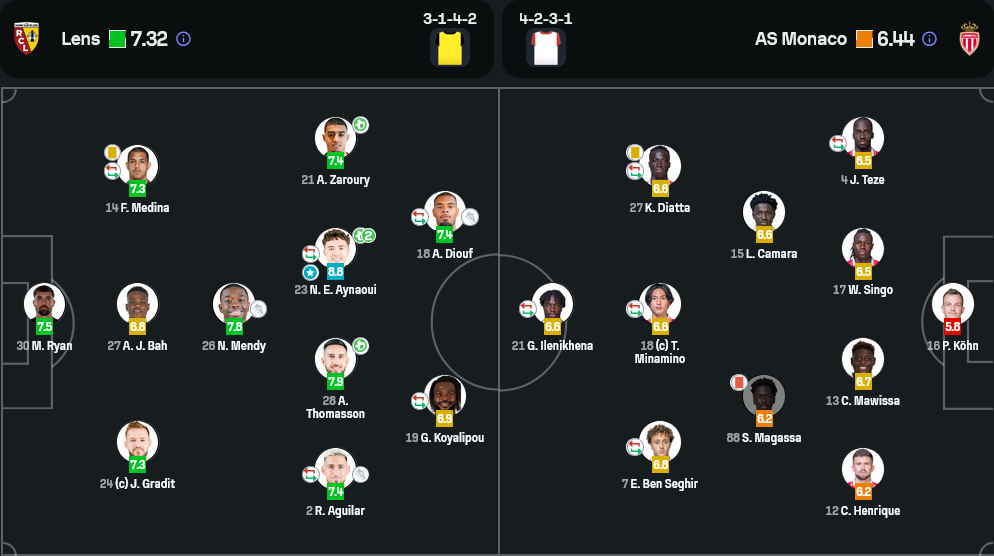 ล็องส์ (3-1-4-2): ผู้รักษาประตู – แม็ท ไรอัน (7.5), กองหลัง – เควิน ดานโซ่, ฟากุนโด้ เมดิน่า (7.3), โจนาธาน กราดิต (7.3), กองกลาง – เอล อัยนาอุย (8.8), เมนดี้ (7.8), โตมาสซง (7.9), ดิยุฟ (7.4), ซารูรี่ (7.4), รากิน อากีลาร์ (7.4), กองหน้า – กายลา ปู (6.9)