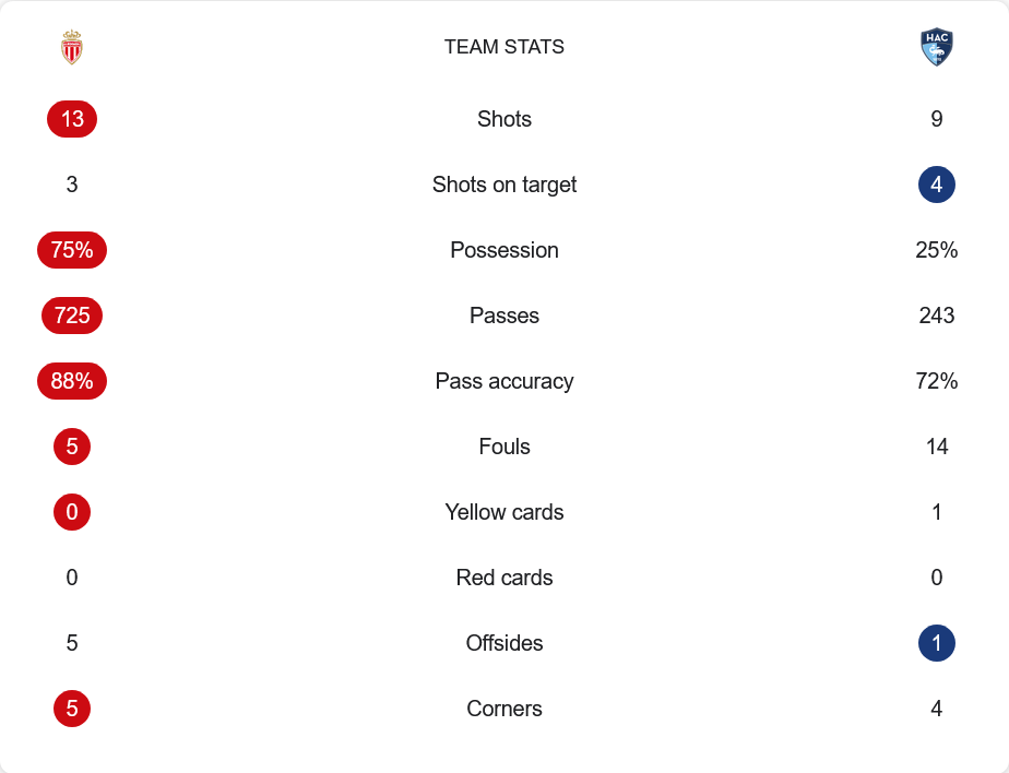 โมนาโกเหนือกว่าชัดเจนทั้งในแง่ของการครองบอลและการคุมจังหวะเกม โดยครองบอลไปถึง 75% ส่งบอลมากถึง 725 ครั้งด้วยความแม่นยำ 88% ขณะที่เลอ อาฟร์มีเพียง 243 ครั้งและความแม่นยำที่ต่ำกว่าแค่ 72% แม้เลอ อาฟร์จะมีโอกาสยิงมากถึง 9 ครั้งแต่ยิงตรงกรอบเพียง 4 ครั้ง ในขณะที่โมนาโกยิงไป 13 ครั้งตรงกรอบ 3 ครั้งและเป็น 3 ประตู สะท้อนถึงความคมและประสิทธิภาพชัดเจน