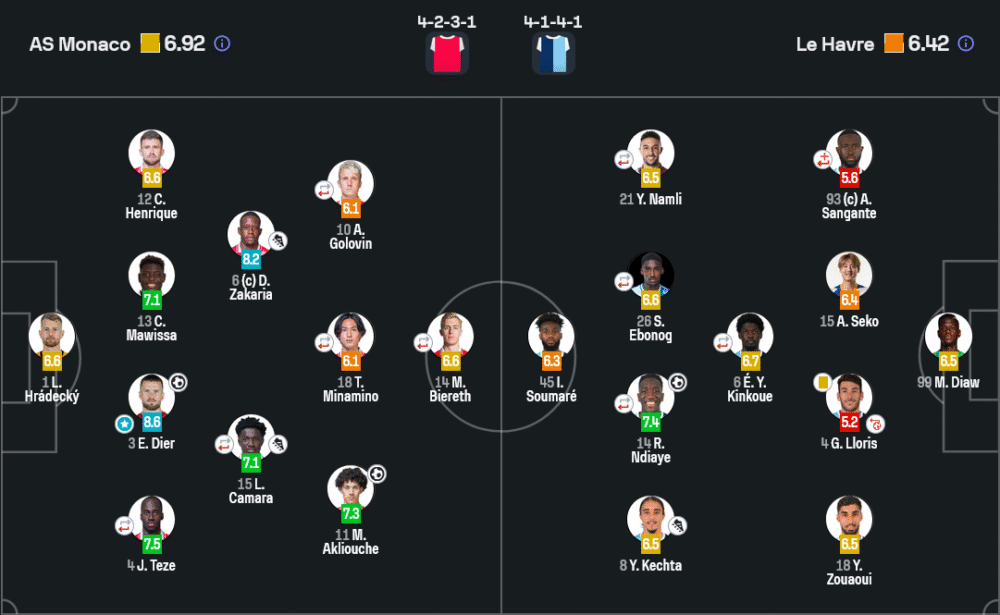 ฝั่งเลอ อาฟร์มาในระบบ 4-1-4-1 ที่เน้นตั้งรับและสวนกลับ ซึ่งเห็นได้จากการครองบอลแค่ 25% แม้แนวรับจะวางแน่นหลายชั้น แต่การสื่อสารผิดพลาดและการโดนกดดันอย่างต่อเนื่อง ทำให้แผนรับสะเทือนอย่างชัดเจน การบุกมีแววในบางช่วง โดยเฉพาะการใช้สปีดของเอ็นดิอาเย่ที่เล่นงานแนวรับโมนาโกได้ดี แต่อยู่ไม่ครบ 90 นาทีเกมก็หมดพลัง