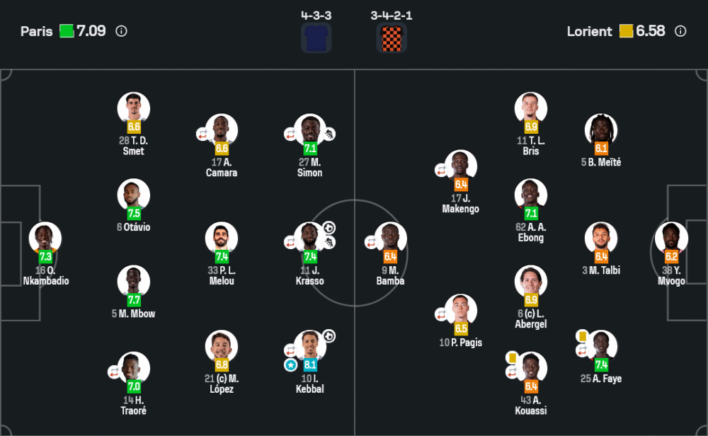กองหน้า: 17 มาก็องโก (6.4), 9 แบมบ้า (6.4), 10 ปาอฌีส์ (6.5)