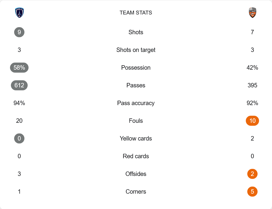 ปารีส เอฟซี ครองบอลเหนือกว่าที่ 58% ทำการผ่านบอลถึง 612 ครั้ง ด้วยความแม่นยำสูงถึง 94% เทียบกับ ลอริยองต์ ที่มี 395 ครั้ง ความแม่นยำ 92% ทั้งสองทีมยิงตรงกรอบเท่ากันที่ 3 ครั้ง แต่เจ้าบ้านใช้โอกาสคุ้มค่ามากกว่า นอกจากนี้ ปารีส เอฟซี ฟาวล์มากกว่า 20 ครั้ง ขณะที่ ลอริยองต์ 10 ครั้ง และทีมเยือนยังได้รับใบเหลือง 2 ใบ เกมนี้แสดงให้เห็นถึงความเฉียบขาดและการจัดการเกมที่เหนือชั้นของเจ้าถิ่น