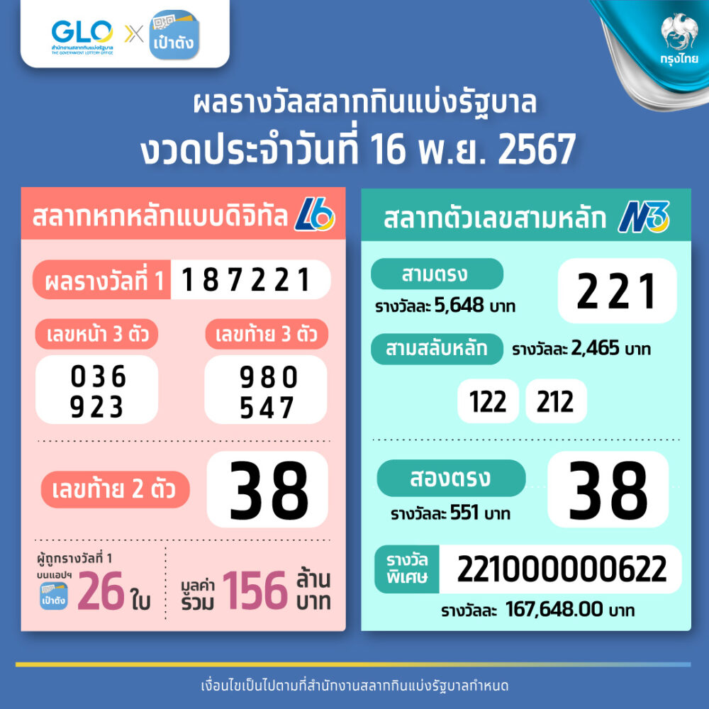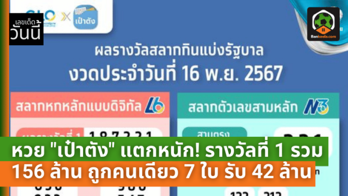หวย “เป๋าตัง” งวดล่าสุดวันที่ 16 พฤศจิกายน 2567 กลายเป็นที่พูดถึงในวงการหวยอย่างหนัก เมื่อผลสลากกินแบ่งรัฐบาลที่ออกมาเป็นหมายเลข 187221 ได้สร้างความฮือฮา โดยมีผู้โชคดีที่ถูกรางวัลใหญ่รวมทั้งหมด 26 ใบ มูลค่ารวมสูงถึง 156 ล้านบาท โดยในบรรดาผู้โชคดีเหล่านี้ มีรายหนึ่งที่ฟาดเต็มๆ ถูกสลากถึง 7 ใบ รับทรัพย์ก้อนโต 42 ล้านบาท กลายเป็นเศรษฐีใหม่ในทันที