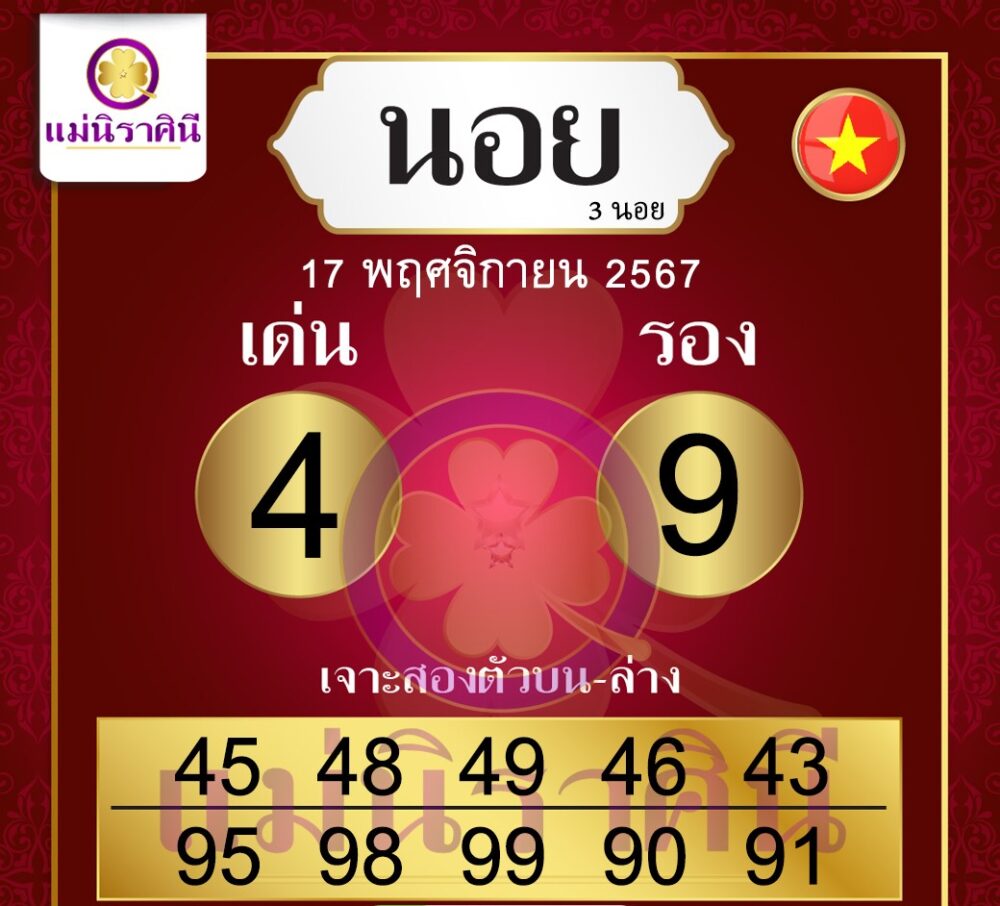 ในงวดนี้ แม่นิราศินีให้เน้นไปที่เลขเด่น 4 และรอง 9 โดยมีเลขสองตัวที่น่าจับตามองอย่าง 45, 48 และ 95 ซึ่งถือว่าเป็นเลขที่มีโอกาสสูง ใครที่ติดตามแนวทางของแม่นิราศินีอย่าพลาดครับ