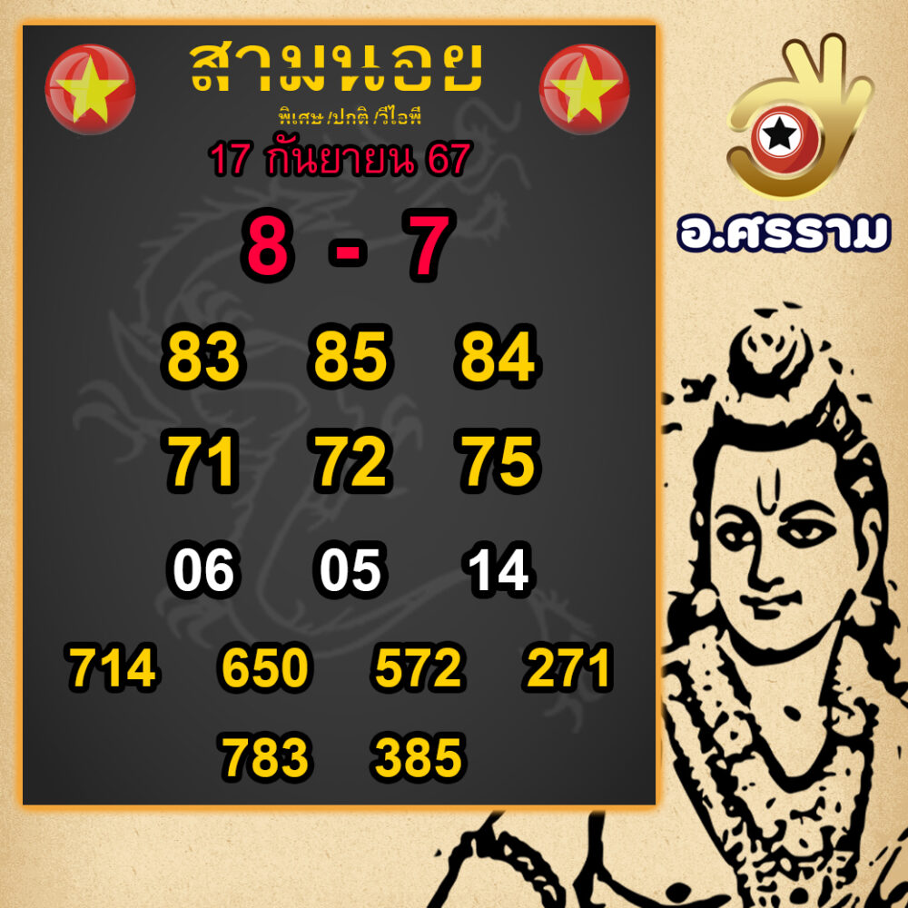 สำหรับแนวทางจากอาจารย์ศรราม งวดนี้เน้นไปที่เลขเด่น 8 และรอง 7 โดยมีเลขสามตัวอย่าง 714 และ 572 ที่น่าสนใจ เลขเหล่านี้ถือว่าเป็นตัวเลือกที่ดีสำหรับนักเสี่ยงโชคที่กำลังมองหาเลขเด็ด