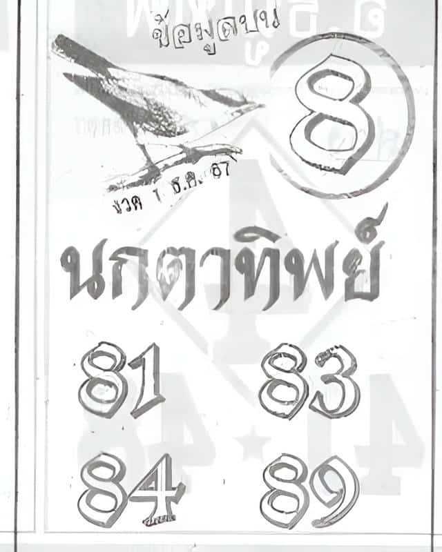 ในงวดแรกของเดือนสุดท้ายปีนี้ นกตาทิพย์ เน้นไปที่เลขเด่นและชุดเลขท้าย 2 ตัวตามแบบฉบับที่คอหวยคุ้นเคย โดยงวดนี้เลขที่โดดเด่นและน่าจับตามองที่สุดคือ เลข 8 ที่มาแรงเหนือใคร พร้อมแนวทางเลขท้ายสองตัวที่จัดเต็มครบถ้วน ดังนี้
